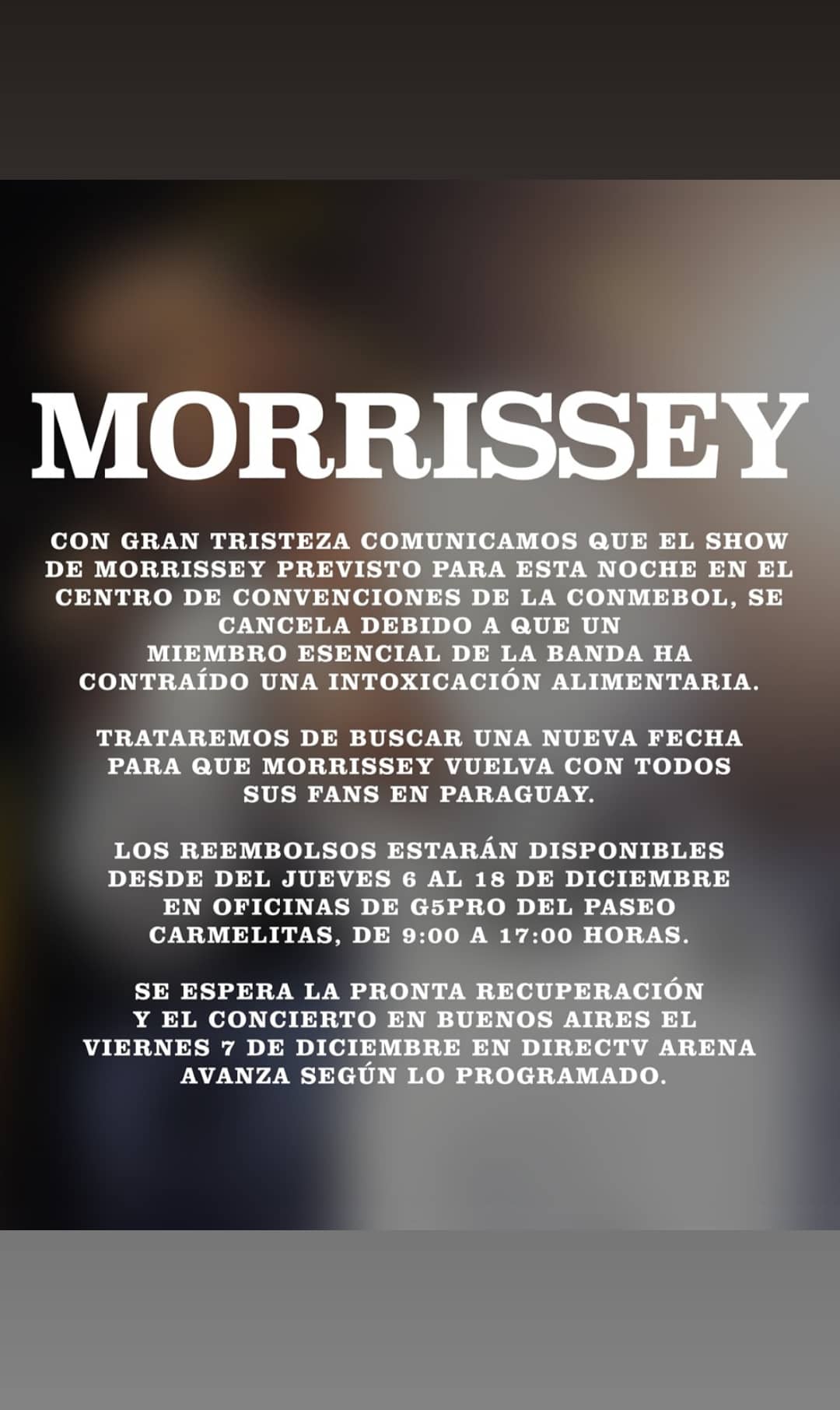 En el día de hoy, Morrissey tenía previsto una presentación en el Centro de Convenciones de la Conmebol de Paraguay pero hace instantes se informó que uno de los miembros de la banda tuvo una intoxicación alimenticia y por este motivo se cancela la presentación.